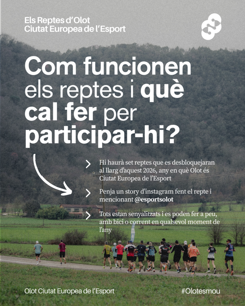 L’Àrea d’Esports de l’Ajuntament d’Olot ha donat el tret de sortida a una de les iniciatives particulars de la capitalitat europea de l’esport. Es tracta dels Reptes de la Ciutat Europea de l’Esport: un conjunt de 7 reptes que es difondran a través de les xarxes socials de l’Àrea d’Esports Olot i de l’Ajuntament d’Olot i que consisteixen en completar 7 rutes pels volts de la ciutat.