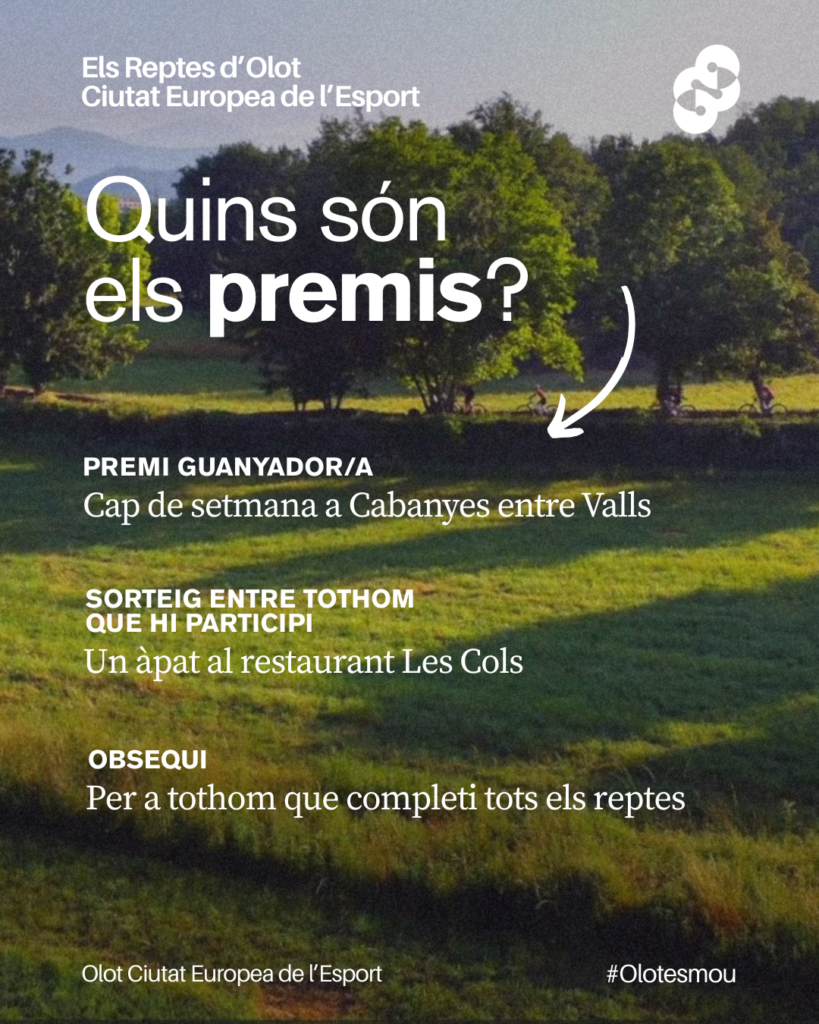 Els guanyadors/es d’aquests reptes es donaran a conèixer en l’acte de cloenda de la Ciutat Europea de l’Esport que es portarà a terme el proper mes de desembre. La persona que reuneixi més puntuació s’emportarà un cap de setmana a Cabanyes entre Valls. A més, també se sortejarà un àpat al Restaurant Les Cols d’Olot entre tots els participants i s’entregarà un obsequi a tots aquells que completin tots els reptes.