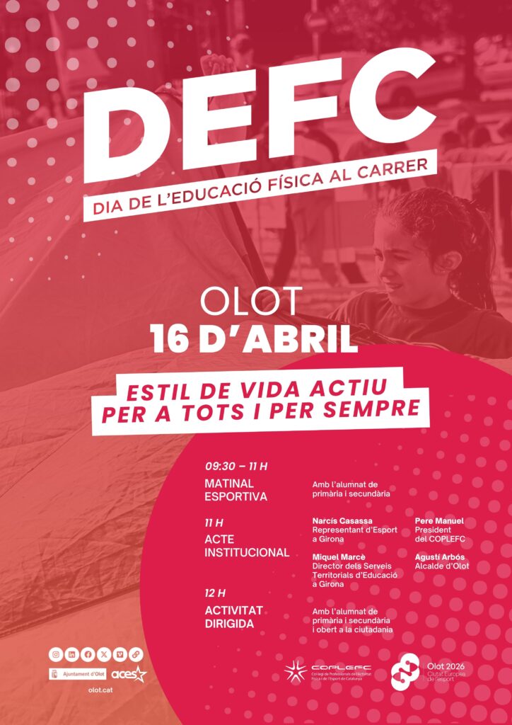 Olot ha estat escollida per ser la seu de l’acte central del Dia de l’Educació Física que se celebra des de fa una dècada a Catalunya. Enguany tindrà lloc el dijous 16 d’abril i és organitzat pel Col·legi de Professionals de l’Activitat Física i l’Esport de Catalunya (COPLEFC). Aquest ens ha seleccionat la capital de la Garrotxa per acollir l’acte institucional de la celebració coincidint amb el fet que Olot és Ciutat Europea de l’Esport aquest 2026.